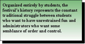 Organized entirely by students, the festival's history represents the constant traditional struggle between students who want to have unrestrained fun and administrators who want some semblance of order and control. The first few Bumstocks featured free beer. Today, beer is not allowed. Being outdoors is such an integral part of the event that organizers rejected an offer by administrators to allow beer if last Friday night's performances were held in Alfond Arena. Organizers had asked for a beer tent.
