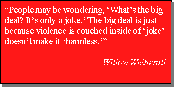 In a column published Monday in The Maine Campus, Wetherall wrote: "People may be wondering, 'What's the big deal? It's only a joke.' The big deal is just because violence is couched inside of 'joke' doesn't make it 'harmless.' Violence against women takes on many forms -- some forms are more subtle and insidious than others -- but it's still violence and it still contributes to a culture that says it's OK to oppress women this way, and that is just not funny."